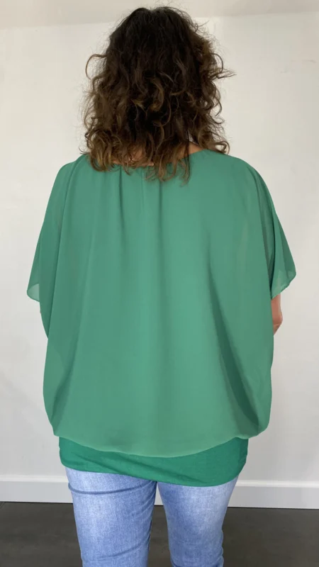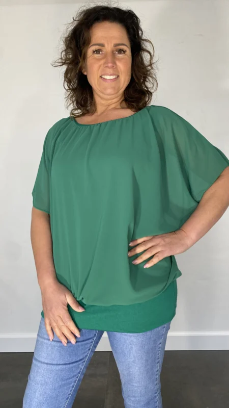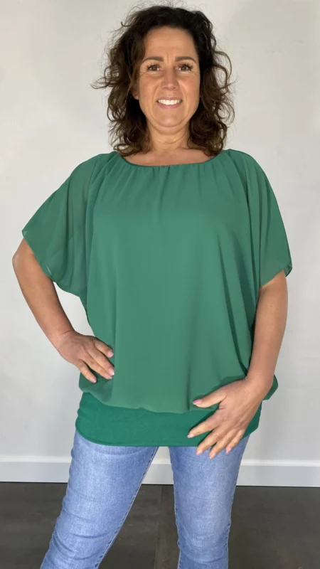 Voile blouse met elastische boord en koste mouw. Deze blouse is gevoerd met een tricot ondertop die vast zit aan de blouse.